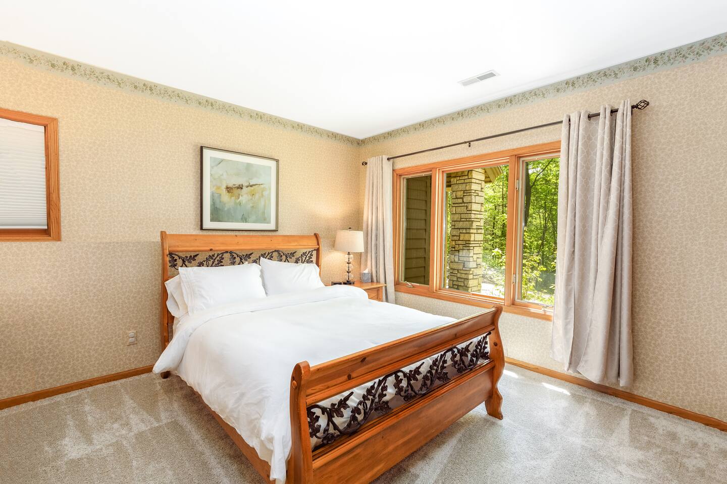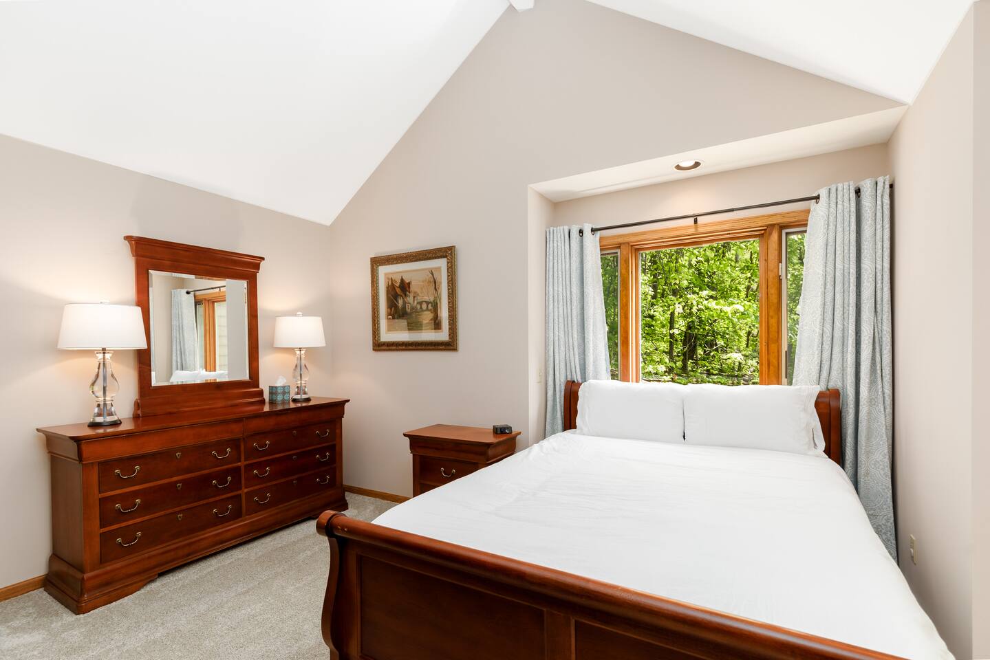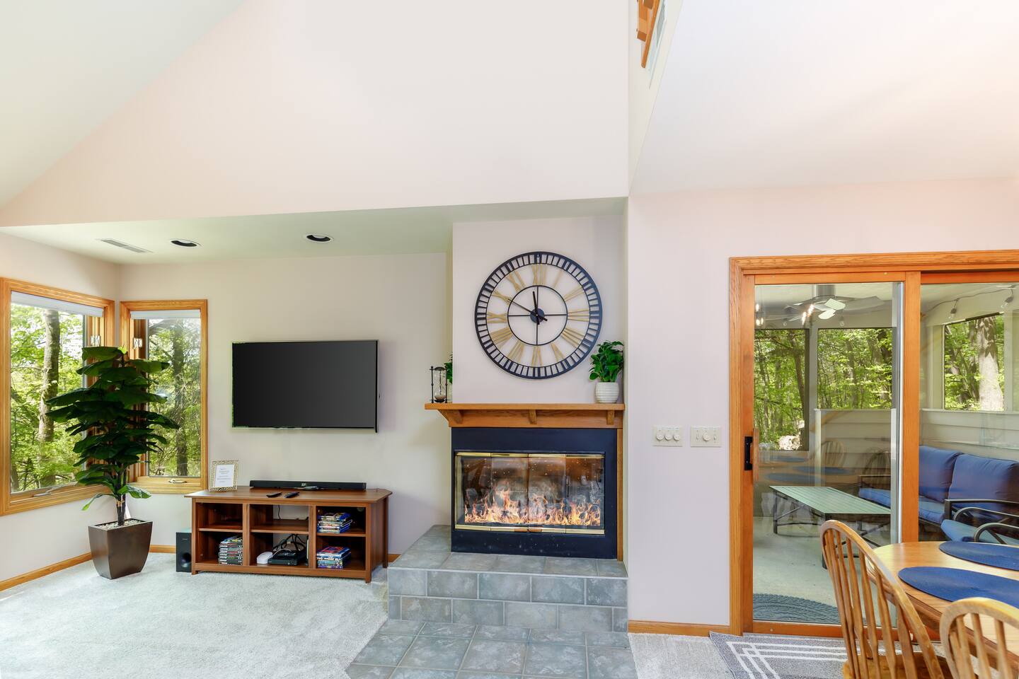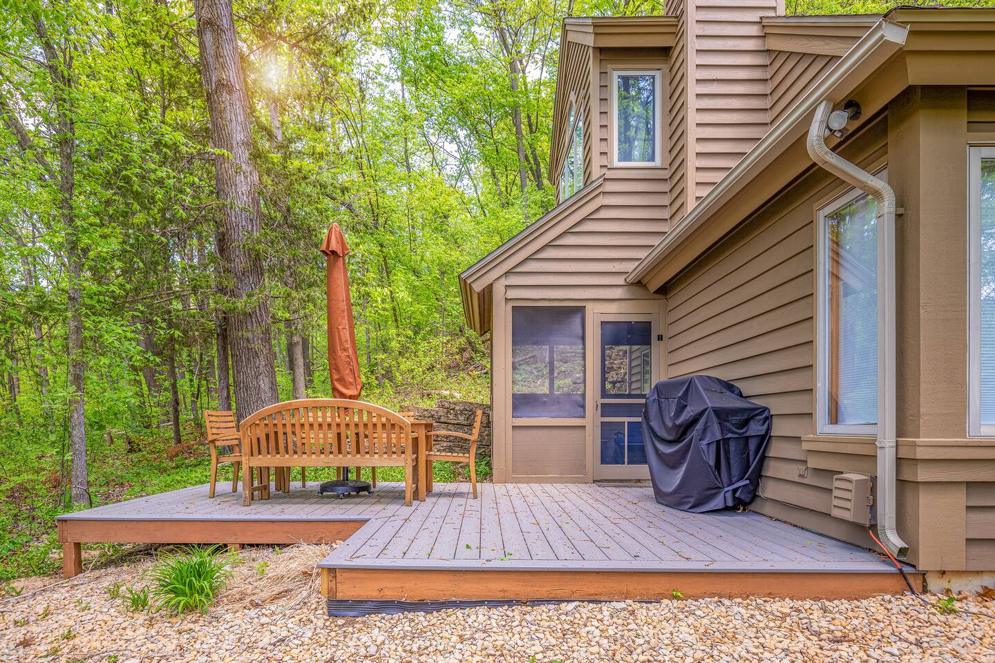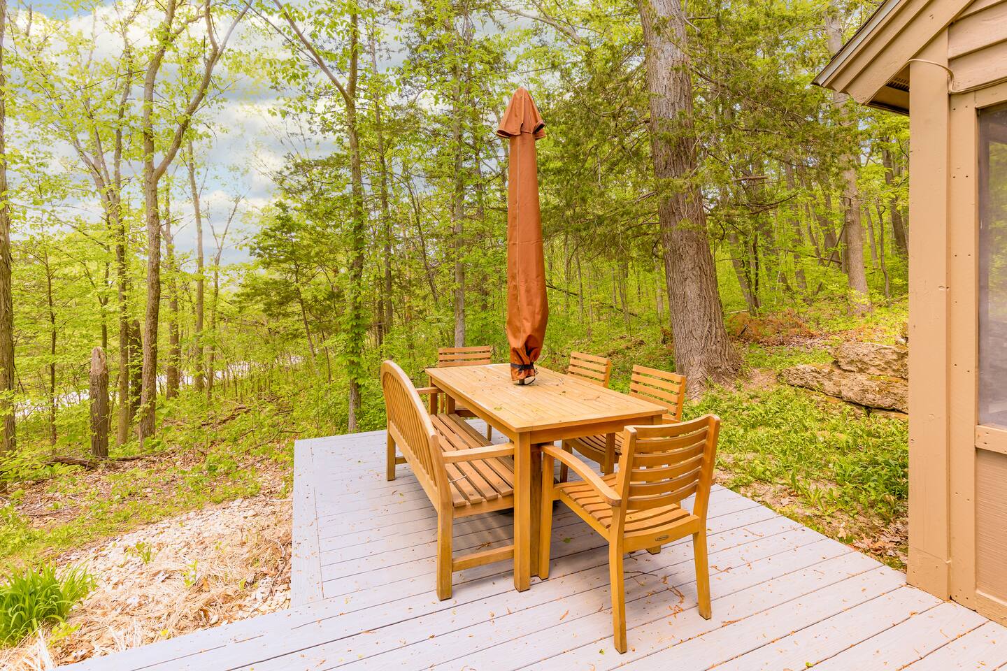 Enjoy wooded views from all windows and the privacy of over an acre with trees in every direction. Our home features a wood-burning fireplace, vaulted ceilings, screened in three-season room, and also a comfortable deck. The main floor includes a master bedroom with full bath, kitchen and dining areas, and our comfortable living room. Upstairs are 2 more bedrooms and another full bath. Perfect for a quick getaway, a weekend to relax, or a longer vacation to visit the beautiful Galena Territory!